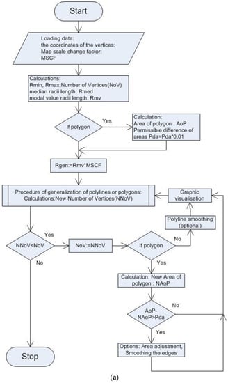 In order to investigate the operation of the vector line generalization algorithm, based on the analysis of the radius of curvature, a computer program in Delphi language was written. A simplified block diagram of the program has been presented in Figure 4a. The input data for the program are: the coordinates of the points forming the vertices of the vector line (polyline) or the coordinates of points of the area (polygon) and the Map Scale Change Factor (MSCF). MSCF is an empirical coefficient that is used to calculate the value of the radius of generalization depending on the map scale value and the modal value of empirical radii of three consecutive vertices on a vector line: