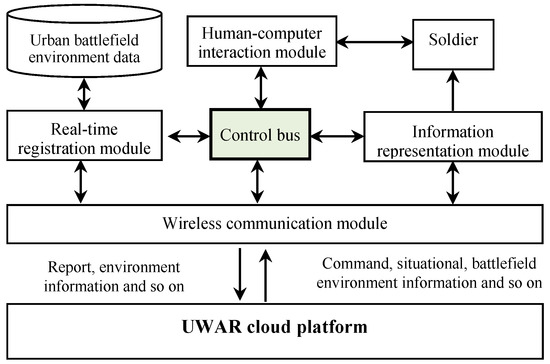 The UWAR system is mainly composed of real-time registration, information representation, human-computer interaction, wireless communication, control bus, urban battlefield environment database, urban operation augmented reality control cloud platform etc. (see Figure 1). The main task of the real-time registration module is to calculate the exact location of the battlefield information officers in the current scene. The information expression module is to display battlefield information in front of soldiers in humanoid form. The human-computer interaction module is employed to accurately understand users’ command and respond quickly while minimizing disturbance to operations. The wireless communication module is responsible for uploading and downloading information. The control bus module is mainly responsible for coordinating the transmission of information between modules, and assigning the computing and storage resources. The UWAR cloud platform on the one hand distributes commands, situational information, intelligence, battlefield environment information to every application terminal, and on the other hand processes reports, registration requests and collects environmental information from the terminals.