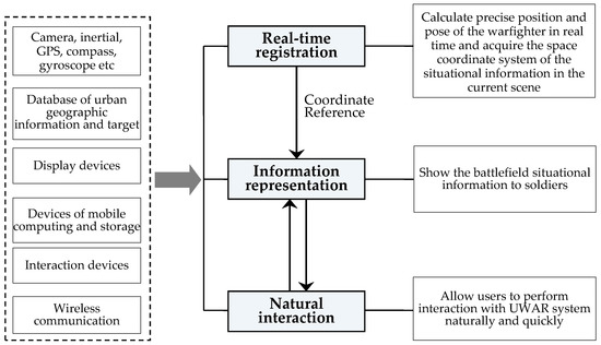The goal of UWAR is to accurately augment the battlefield situation information which soldiers need into the real world. To achieve this, it depends on three key technologies: real-time outdoor registration, information presentation, natural interaction. Figure 2 shows the composition of the three key technologies of UWAR and the relationship between them.