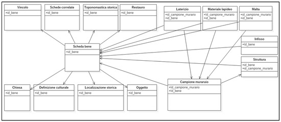The schemas created in the DB are “decodifica”, “campione_murario”, “infisso”, “struttura”, and “unità_architettonica”. Each schema contains the tables pertaining to a single input form. The “decodifica” scheme contains the tables of the domains used in the input forms, such as the municipalities and provinces of the Sardinia region. Some fields of the input forms have closed dictionaries in order to prevent misspellings and variant spellings, which would make queries impossible. The forms were written in the Italian language.
