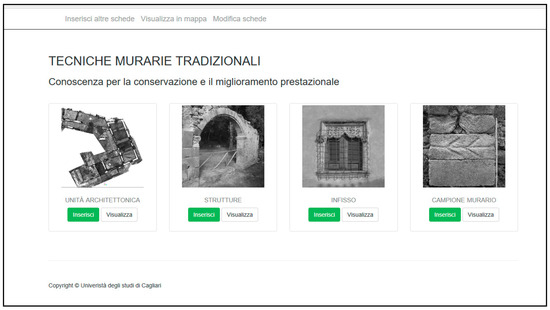 - Fiorino, D.R.; Pintus, V.; Vacca, G. Un WebGIS per conoscenza e tutela delle tecniche murarie tradizionali in Sardegna. Annanke 2017, 29–134. [Google Scholar]