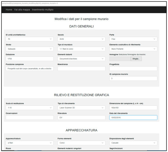 The modularity passes through the main structure of the data, which was conceived with two levels of depth: the “unità architettonica” (architectural unit) record contains the territorial census of the assets according to an anagraphical-descriptive layout, which collects the foremost historical and architectural features of each asset. Several sub-records are associated to the architectural unit, including the geospatial location as well as the “strutture” (structures), “infisso” (fixture), and “campione murario” (masonry sample) sub-records, which describe the specific technological features of the construction elements of the architectural unit from formal, dimensional, material, structural, and energy efficient points of view.