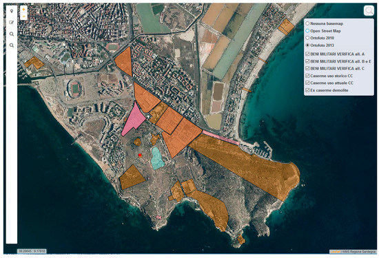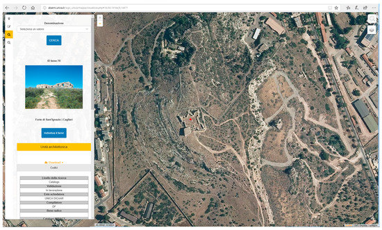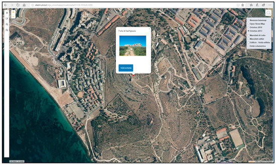 In the WMS provided by Geoserver, each architectural unit in the geodatabase is rendered with a point geometry primitive. The WebGIS also connects to some base maps provided by the Sardinia region geoservices [49,50] (specifically, the 2010 and 2013 orthophoto mosaics), and some layers from the regional Multi-Precision GeoDatabase that were meaningful for this project: “Manufatti di culto” (Religious items), “Manufatti edilizi” (Building items), “Edificio-Unità immobiliare” (Building—Construction Unit), and “Unità Volumetrica” (Building—Volume Unit). Finally, the WebGIS allows for use of the Open Street Map dataset as a base map. The orthophotos and Open Street Map can be alternately displayed using the layer control (Figure 5). The datum used in the WebGIS and the entire infrastructure is ETRF2000 [51].