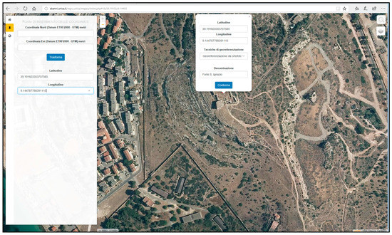 Another functionality of WebGIS is the updating of the geodatabase using an entry form that allows geolocating the architectural unit either by placing it on the map or by providing its ETRF2000 geographic coordinates, as shown in Figure 7. This operation activates a trigger that updates the geometry field of the architectural unit table.