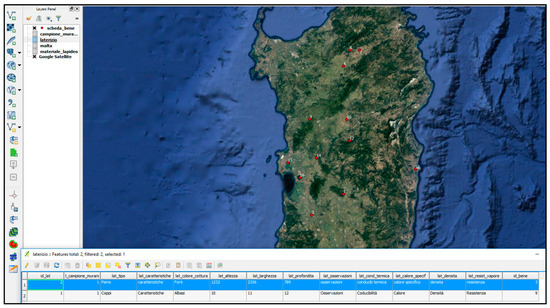 In this work, the geodatabase is accessed from QGIS through a database connection. The geodatabase can be both browsed and edited in the QGIS client, as shown in Figure 8. In order to connect the second level tables (“Infissi”, “Strutture”, and “Campione Murario”) that contain no geometry data, a Python “action” uses the relationships between the architectural units table, containing the spatial component, and the related second level tables, so that the geometry can be selected starting from the first level table. This “action” was developed by Andrea Borruso and Salvatore Larosa [54].