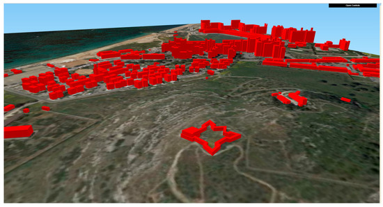 The 3D GIS was built from the “Unità Volumetrica” (Buildong—Volume Unit) class of the geodatabase of the Sardinia region. The features in this class represent a part of a building having constant ground and a top altitude, and are polygon primitives with “ground altitude” and “top altitude” attributes. Using this information, it is possible to extrude the polygons into 3D models of the architectural units. The volume units were joined to the geodatabase using the “ID_Bene” (Asset ID) field. In Figure 11, it is possible to see the Sant’Ignazio Fort (Fortino di Sant’Ignazio) in pink and its data. Due to many interdisciplinary studies carried out on the site, this defensive architecture is completely described in the SIS under several points of view. Beyond the single element, the SIS is able to represent the related military net (see Figure 12), with the possibility of comparing location, morphologies, typologies, chronologies, materials, techniques, and state of conservation. Moreover, in future developments, urban planning and design modules may be added in order to manage interventions and transformations.