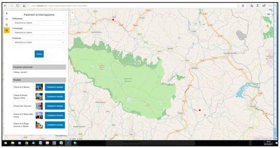 The WebGIS also presents some simple query operations that allow a non-expert user to query the data according to name, type, age, and location criteria. The following Figure 10 shows a query on the “Definizione” (Definition), “Cronologia” (Chronology), and “Provincia” (Province) fields.