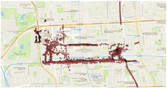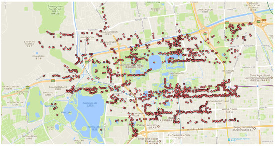In terms of the Geolife [36,37] project dataset description, the location data were collected at five-second intervals; i.e., the location’s latitudes and longitudes would be collected if the user’s speed was at least 3.0 miles per hour. This means that if the user’s speed was below 3.0 miles per hour, the data collection was stopped (e.g., taking a tour in the garden, watching a movie in a theater, exercising in the gym, or visiting a friend’s home). The recorded last location point signifies the user’s point of interest. Suppose a user was riding a bike to the gym and parked her bike at the parking place and the last location was recorded. Then, the adversary might conclude that the gym is one of the user’s points of interest (considering that she is not running).