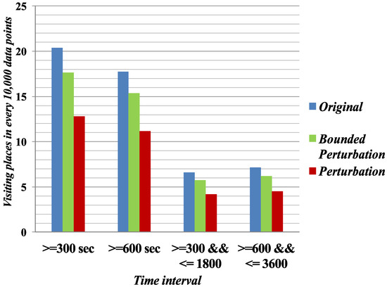 In the experiment, the individual query was made by using Equation (5), and a search was conducted on the original and anonymized datasets. Suppose that we want to count the number of users in Area 1, Day 1, and the Morning session. Then, the query returns the count for original and anonymized datasets. From the results of the original and anonymized datasets for Area 1, Day 1, and the Morning session, the relative distortion of the visiting users for the particular session was calculated by Equation (3). In the experiment, we selected 30 individual days, morning and evening sessions, and all possible areas to calculate the distortion. After that, the average distortion was calculated by Equation (4). Table 3 presents the average relative distortion in the anonymized dataset. Experimental results demonstrate that the bounded perturbation achieves better data quality.