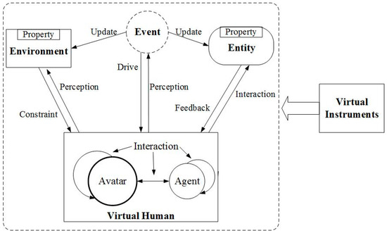 The human–environment relationship refers to the relationship between the existence and development of human society, or the human activities and the geographical environment [36]. The geographical environment here is considered to be the entire geographic environment, encompassing natural and human elements. They are intertwined in accordance with certain rules, and are closely integrated. The literature [37] suggests that VGEx can be categorized into virtual natural geographic experiments and virtual human geographic experiments. Virtual natural and human elements constitute the “environment”, while individuals, groups, and society in the VGE constitute the “human” in a virtual experiment. Due to network and other technological limitations, collaborative VGEx, even based on distributed technology, cannot normally support the number of concurrent users of a real human society. However, virtual crowd experiments at the individual or group level could be affordable. According to the human–environment relationship theory [37], we categorize the VGEx into three types of elements: human, entity, and environment. These elements and their relationships are shown in Figure 1.