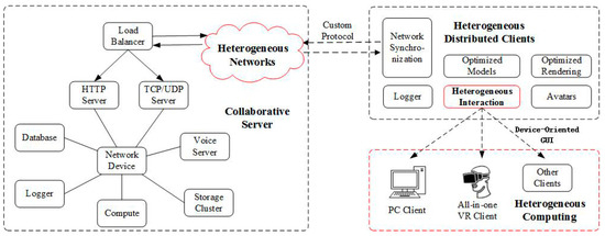 In this paper, we propose several optimization solutions to address the heterogeneous problems identified in the previous paragraph. We use these optimization strategies to ensure that our system runs smoothly, even on low-configuration computing platforms. We propose an abstract interaction layer to adapt to the interactions of heterogeneous devices, and use protocol-based interaction algorithms to ensure the consistency of user experience across different clients. We use a distributed architecture design to solve the problem of the non-synchronization of user states caused by network delays, so that the system can be deployed in heterogeneous networks. Fire drills are used as a case study to demonstrate the applicability of the presented framework. This design allows us to conduct virtual experiments using both the LAN and the Internet, which could facilitate participation from different geographic locations. The specific algorithms will be described in Section 3.2.
