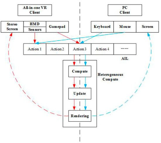 Interactive devices and methods vary greatly between HDVGE clients. The interactive devices of PC clients include the keyboard, mouse, and monitor. They use the mouse to control the viewpoint rotation, and use the keyboard to control the viewpoint movement, trigger skeletal animation, and perform other actions. The interactive devices of all-in-one VR clients mainly use the HMD, gamepad, and stereo screen. The HMD is equipped with a high-precision nine-axis sensor, which is a combination of three sensors: a three-axis accelerometer, a three-axis gyro, and a three-axis electronic compass. Among them, the HMD mainly uses the three-axis gyroscope to measure, obtain the attitude parameters of the helmet, and then reconstruct the user’s 3D motion. That is, the user controls the rotation of the viewpoint using the HMD, controls the viewpoint movement using the gamepad, and triggers the skeleton animation using buttons. Although the devices and methods vary considerably, the ultimate goals are the same. Therefore, in order to be compatible with different interactions between heterogeneous clients, we designed an abstract interaction layer (AIL), so that the different interactive methods can achieve the same results. Figure 3 shows a typical interaction process. The left and right sides of the figure represent the interaction process of the all-in-one VR and the PC client, respectively.