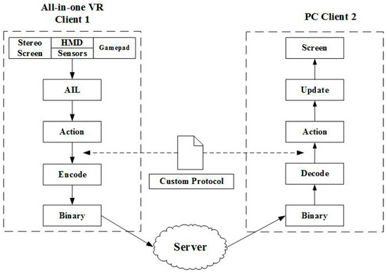 A typical data transmission process based on a custom protocol is shown in Figure 4. First, a user of an all-in-one VR changes his status locally. Then, based on the type of heterogeneous client, this interaction is mapped to standard actions by the AIL. Next, the system uses the custom protocol to encode the standard action. To improve network transmission efficiency, the encoded result is converted to binary form before being transmitted to the server. After receiving the status update from client 1, the server calculates and processes the status information, and then forwards it to other clients in the current scene.