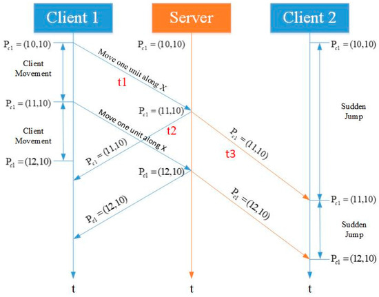 A typical client state synchronization process of an HDVGE is shown in Figure 5. We assume that the network latency for each client is consistent throughout the process. The initial position of client 1 is (10, 10), and it moves one unit along the x-axis. Client 1 sends a new status to the server while moving the local avatar. The data reaches the server after t1 time. Then, the server receives the new status sent by client 1, and starts to broadcast to other clients. The broadcasted data reaches client 1 after time t2, and reaches client 2 after time t3. At this point, client 2 can see the new status of client 1. In the process, the network delay of client 1 is (t1 + t2), while the new status of client 1 reaches client 2 after (t1 + t3). That is, the status of client 1 as seen by client 2 is actually the former’s status before time (t1 + t3).