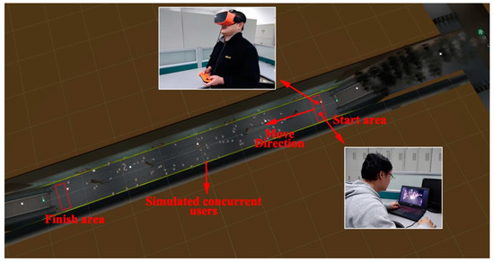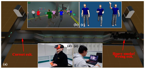 Helmet-mounted VR devices can provide participants with a strong sense of immersion and real-time interactivity, which can enhance the effectiveness of existing research. Moussaïd et al. [29] constructed a desktop personal computer (PC)-based multi-person collaborative virtual environment. They carried out crowd movement experiments in both real and virtual scenes. They also proved the feasibility of using a shared 3D virtual environment to carry out crowd experiments by involving real people. A cave automatic virtual environment (CAVE) is an immersive virtual reality environment where projectors are directed to between three and six of the walls of a room-sized cube [30]. Weiya Chen [31] used a large CAVE-like system to design an immersive, multi-user, and multi-sensor virtual environment. The system used infrared devices to track user movements, and shutter glasses to provide immersion and access to head activity data. However, desktop PC-based VR [29] is less immersive than state-of-the-art helmet mounted display (HMD) VR, and large CAVE-like systems [31] are expensive.