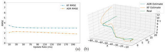 Comparison between adjusted dead reckoning (ADR) and the Kalman filter (KF): (a) accuracy of the two algorithms and (b) real prediction results.