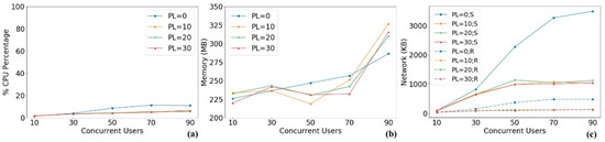 Server resource consumption with different numbers of concurrent users and packet lags: (a) CPU percentage; (b) memory; (c) network (PL stands for packet lag. S refers to sent traffic, while R refers to received traffic. Abbreviations in other figures have the same meanings).