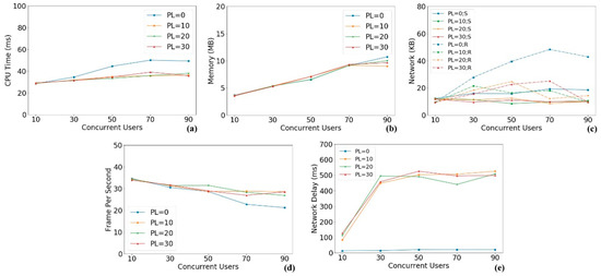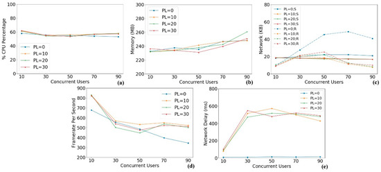 PC resource consumption in different number of concurrent users and different packet lags: (a) CPU percentage; (b) memory; (c) network; (d) framerate per second; (e) network delay.