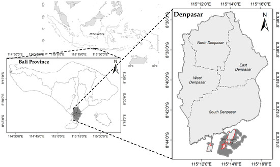 The population of Denpasar reached 335,196 people in 1992 and increased to 880,600 people in 2015, an increase of more than 250%. Topographically, the study area has a flat relief with zero elevation in the south and southeast, a highest elevation of 89 m a.s.l. in the north, and an average elevation of 23 m a.s.l. In general, the rainfall patterns of the Denpasar area are influenced by monsoons, with the maximum amount of precipitation occurring during the peak of the wet season from December to February and decreasing to a minimum during the valley of the dry season from June to August [44,45]. Moreover, the annual average temperature of Denpasar is 27.6 °C, the average annual rainfall is 1803.62 mm year−1 [44], and settlement was the dominant land use in Denpasar city in 2006 followed by rice field areas [46].