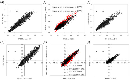Scatter plots of the Landsat base index from the main data with the data used for patching the no-data regions caused by clouds and their shadows. Top panels present enhanced vegetation index (EVI) and bottom panels present land surface water index (LWSI). (a,b) for Landsat 5 on 3 February 1995 with 26 May 1995; (c,d) for Landsat 7 on 21 March 2003 with 28 March 2003 (black dots) and for 21 March 2003 with 22 April 2003 (red dots); and (e,f) for Landsat 8 on 27 March 2014 with 11 March 2014.