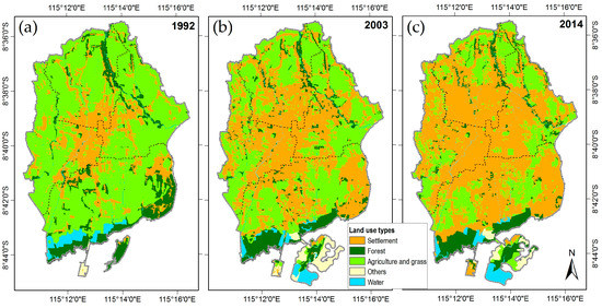 Distribution of land use types in Denpasar, Indonesia from topographic maps. (a) 1992; (b) 2003; and (c) 2014.