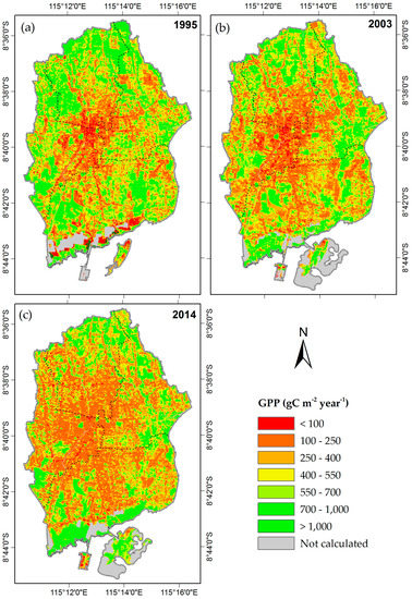 Annual gross primary production (GPP) distribution in Denpasar from Landsat satellite data analysis. The grey colour indicates that the area is not counted due to land use types such as water and others. (a) 1995; (b) 2003; and (c) 2014.