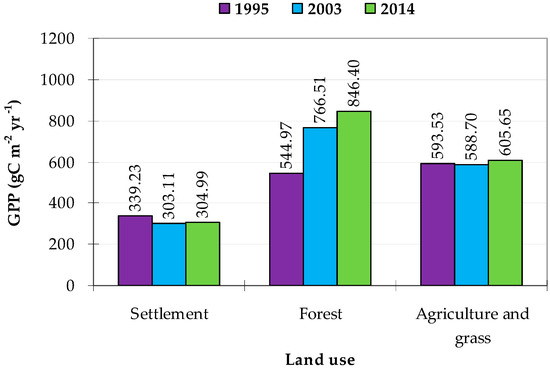 The VPM was used to estimate GPP in 1995, 2003 and 2014 in the tourism city of Denpasar. Table 4 reports the annual total GPP estimates for each of the land cover types and their percentage of the total. Meanwhile, the spatial distributions of annual GPP in Denpasar as analysed from the Landsat satellite data by the VPM method for 1995, 2003 and 2014 are presented in Figure 4. Because the current study only studied changes in GPP, the study only shows GPP values for land use types related to greenspaces and settlement and does not include GPP values for non-greenspaces and settlement land types. The annual GPP for the entire region in the years 1995, 2003 and 2014 was estimated to be 61,609.15, 55,621.81 and 53,815.19 tC year−1, respectively. In 1995, the estimated GPP in agriculture and grassland accounted for the largest portion, approximately 75.37% of the total estimated GPP, followed by forest with a proportion of 13.10%, and settlement accounted for 11.53%. It can be clearly seen in Figure 4a that the GPP was estimated to be higher than 550 gC m−2 year−1 in the agriculture and grass land use type. In 2003, the allocation of agriculture and grassland still accounted for the largest area, although it is lower than that in 1995, 55.33% of the total area, while the forest and settlement land use types exhibited increasing allocations of estimated GPP with proportions of 16.61% and 28.06% of the study area by the year 2003, respectively. There is an interesting spatial pattern of estimated GPP in 2003. Inside the area around the settlement, there is still a fairly high GPP value (>550 gC m−2 year−1), and the south part of Denpasar has been dominated by high GPP values as a result of the replanting of mangroves. However, the high estimated GPP regions in the southeastern part of Denpasar in 1995 became more fragmented and scattered with low values of GPP in 2003 (Figure 4b), while the same location in 2003 was dominated by multi-functional buildings that serve tourism activities. Interestingly, the GPP estimation for settled areas has overtaken that of agriculture and grass areas, with a value of 41.39% of the total GPP estimation in 2014. The GPP estimation from forest increased by 19.08%, while that of agriculture and grass areas also declined, although the proportion was still quite large with a share of 39.53% of the total area in 2014. It is noteworthy that compared to their spatial pattern in 2003, the medium to high value GPP values were more fragmented and scattered around the regions with low GPP estimates in 2014. High estimated GPP was clearly observed in the southern part of Denpasar and in small areas of the agriculture and grass land use type (Figure 4c).