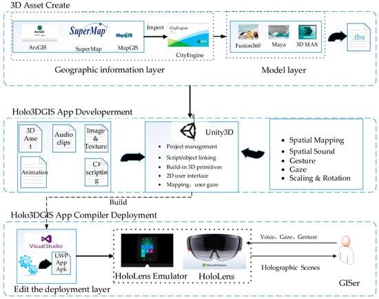 The main goal of this paper is to realize the integration of 3D geographic information and mixed reality with a head-mounted HoloLens display. To achieve this goal, Holo3DGIS is designed, as shown in Figure 1, with three processes: the creation of 3D assets, the development of Holo3DGIS applications, and the compiler deployment of Holo3DGIS applications. Creation of the 3D asset layer provides 3D geographical scene content for the Holo3DGIS application. Development of the Holo3DGIS application layer is responsible for designing the interaction between 3D geographic information and users. Compiler deployment of the Holo3DGIS application layer ensures that the application is deployed to the HoloLens or a high-performance computer.