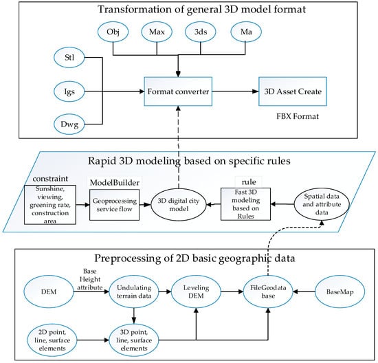 A 3D asset mainly includes a geographic scene model and a third-party 3D model, which provide material and content for the Holo3DGIS application. The geographic scene model is a 3D geographical model that is transformed from basic 2D geographic data. The third-party 3D model is a model built by other modelling software. As shown in Figure 1, creation of the 3D asset consists of a geographic information layer and a third-party model layer. The geographic information layer is responsible for preprocessing 2D basic geographic information and rapidly executing the 3D model based on specific rules to create a geographic scene model for Holo3DGIS. The model layer mainly provides a third-party 3D model for Holo3DGIS, making full use of the existing 3D model. Since the default formats of different modelling software are inconsistent, format converters are needed to convert different model formats into a general 3D model with an FBX format (FBX is a free 3D data interchange format across platforms). Figure 2 shows a flowchart of the 3D asset creation method in the Holo3DGIS. The three processes of the flowchart are the preprocessing of 2D basic geographic data, the rapid 3D modelling of the data based on specific rules, and the transformation of the general 3D model format.