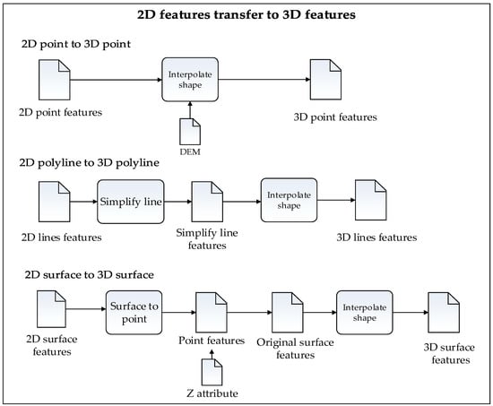 Step 1: 2D features are transformed into 3D features based on terrain undulation (by the ArcGIS ModelBuilder tool); then, 2D point, line and polygon features can be transformed by batch processing into 3D point, polyline, and polygon features. The main idea is to complete the transformation of 2D features into 3D features using the Z information of the features for interpolation. The specific transformation algorithm flow is shown in Figure 3.