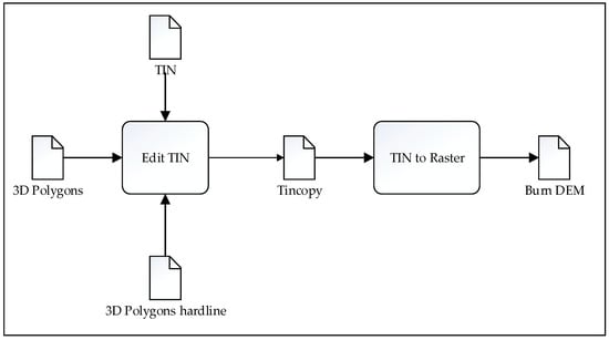 Step 2: The 3D polygons are burned into the DEM. Because most 3D polygons cannot merge into the DEM nicely, they need to be burned into the DEM. Burning includes two parts: editing the triangulated irregular network (TIN) and transforming the TIN into a grid. The specific algorithm flow chart for burning 3D polygons into DEMs is shown in Figure 4.