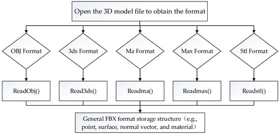 Three dimensional geographic scenes require the use of existing 3D models with different formats (such as Max, obj, x, FBX, and DAE) to save money by reusing 3D models. Different formats of 3D models are incompatible and heterogeneous; therefore, they must be transformed into a general 3D model format. The FBX format is a common and generally-accepted 3D model format. In this paper, different formats of 3D models are transformed into the FBX format. The specific conversion process is shown in Figure 5. First, the 3D model file is obtained; then the format of the file is determined and an existing reading algorithm that matches the format is found. Information on the file points, planes, normal vectors, material texture, and other information are obtained. Finally, these data are stored in the FBX general storage structure.