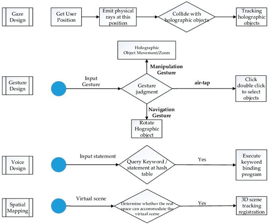 As shown in Figure 1, the development of the Holo3DGIS application is mainly comprised of two parts. The first part is the geographic scene model, which is created by the 3D asset layer. The second part is the interactive design, which is responsible for the interaction between the user, the virtual geographic world, and the physical world. In this paper, the Unity3D game engine is used as the core development platform. In addition, this study uses the Holotoolkit Software Development Kit (SDK) integrated with the Unity3D game engine. The Holotoolkit SDK integrates the basic class library that is responsible for the interaction design, where voice design, gaze design, and gesture design are responsible for achieving a natural and concise interaction between users and the 3D geographic information. The spatial mapping design is responsible for the interaction between the virtual world and the physical world and the seamless integration of the virtual world with the physical world. Figure 6 shows a logic diagram of the interactive design.