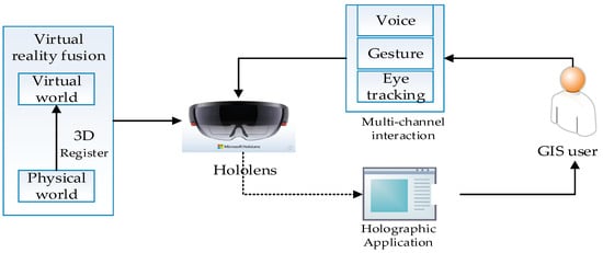 The deployment pattern of small scenes deploys Holo3DGIS applications to the HoloLens devices directly. The process for computing and rendering the entire Holo3DGIS application, including the interaction process, is accomplished independently by the HoloLens. As shown in Figure 7, the holographic application consists of two parts: the physical world and the virtual world. The virtual world refers to the geographic scene created by the 3D asset layer. The physical world refers to the target space acquired by the HoloLens scanning digitization, and the physical world is registered into the virtual world through spatial mapping.