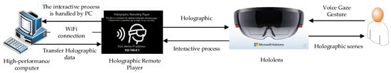 Since Holo3DGIS applications are oversized, which leads to HoloLens rendering delays, this paper designs a deployment pattern for large scenes to solve the problem. Figure 8 shows the Holo3DGIS application deployment diagram for large scenes. The main technology of the deployment pattern for large scenes is the use of the HoloLens holographic remote player middleware. With the holographic remote player technology, the HoloLens is connected to the Unity3D engine on a PC. All rendering calculations are transferred from the HoloLens to a high-performance PC. The computer passes the rendered calculations of the holographic image through wireless-fidelity (Wi-Fi) and transmits it to the HoloLens in the form of frames. The HoloLens is only responsible for displaying, capturing, and transmitting interactive information, such as gestures and voices, to the PC computer in real time. During this process, the holographic remote player acts as an intermediate bridge between the PC computer and the HoloLens. The specific deployment design is shown in Figure 8.