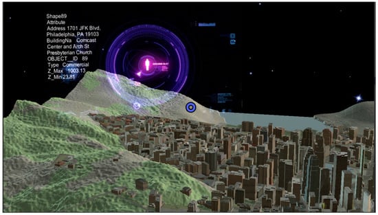 Traditional 3D GIS only provides a single way to interact, using the mouse and the keyboard, while Holo3DGIS provides several types of natural interaction, such as gaze, gesture, and voice, to achieve interaction between users and 3D geographic information. Out of the three interactions in Holo3DGIS, gaze is the first input and the primary form of targeting within the holographic geographic scene. Gaze reveals where the user is looking in the world and determines their intent []. Gesture and voice interactions are used to implement specific GIS operations. The principle of gaze design is the position and orientation of the user’s head, not their eyes, to determine their gaze vector. As the user looks around the room, the gaze vector intersects with the holographic 3D geographical scene, and the intersection point is where sight should be focused. To achieve gesture interactions, the hand needs to be tracked first to capture the gesture. The Holo3DGIS application only recognizes two gestures: “Put the index finger back to the face” and “Click (index finger points face down)”. The Holo3DGIS application automatically ignores all other gestures. The range of HoloLens gestures is only within the conical range ahead of the device, which is called a gesture frame. When the user’s hand moves away from the gesture box, there is a direction vector reminding the user to place the hand in the identifiable area. Figure 10 shows a schematic of the gaze interaction. The light ball locations are where the user’s line of sight is located in a geographical scene. These light balls are used to implement feedback to the user’s line of sight. Figure 11 shows a schematic of the gesture interaction. The schematic shows the properties and spatial information of the holographic object that are viewed by the gesture interaction. Gesture interactions, in addition to the query of geographic entities through air-tapping, also include “navigation gestures” to achieve the rotation of holographic geographic scenes, which allows users to browse the digital city of Philadelphia from different angles. In addition, using manipulation gestures, users can browse the city of Philadelphia from different scales, which allows the users to better understand the virtual geographic world. The voice design is similar to the gesture operation, but it only anticipates hand gestures. It is most convenient for users to operate three-dimensional geographic information with voice commands.