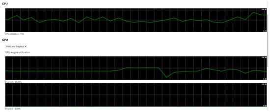 In this experiment, the same application is deployed by two deployment modes for a small scenario and a large scenario. The CPU and GPU data percentages corresponding to the two modes are obtained. The results show that the large scenario deployment mode can reduce the power consumption of the HoloLens. As shown in Figure 12 and Figure 13, a 576 MB Holo3DGIS application is deployed on the HoloLens and on PC computers; the rates of use for the HoloLens using CPU and GPU are compared. From the data in the figure, it can see that when the deployment of the Holo3DGIS application is transferred from the HoloLens to the computer, the utilization rate of the HoloLens CPU is reduced from 71% to 47%. The utilization rate of GPU Engine0 is reduced from 34.96% to 23.81%, and the utilization rate of GPU Engine1 increased from 0% to 15.18%. GPU Engine0 refers to the HoloLens GPU headset, GPU Engine1 refers to the computer GPU. Therefore, when the deployment of the holographic application was transferred from the HoloLens to the computer, the rate of use for the HoloLens CPU and GPU engines declined, while the rate of use for the computer GPU engine increased from 0% to 15.18%. From the above experiments, it can be seen that if the speed of the network and the performance of the computers meets the experimental requirements, the HoloLens can also be used as a rendering platform for geographic scene data.