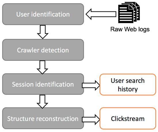 Profile analyzer extracts user access pattern from raw web logs. The log processing workflow has four steps: user identification, crawler detection, session identification, and structure reconstruction (Figure 2). The user identification step identifies each individual user through IP address and web browser. The crawler detection step detects and removes web logs generated by the robotic activities. The session identification splits a sequence of web logs of each user into sessions representing single visits of that user. The session reconstruction step connects user actions according to the previous page information of the web log. More details can be found at Jiang, Li [25].