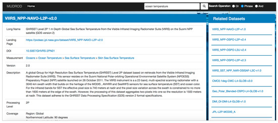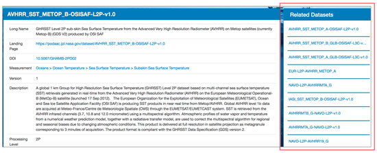 Figure 11 shows the recommendation results of a selected dataset—“AVHRR_SST_METOP_B-OSISAF-L2P-v1.0”, which is the GHRSST Level 2P sub-skin Sea Surface Temperature from the Advanced Very High-Resolution Radiometer (AVHRR) on Metop-B satellites produced by OSI SAF. The first three datasets are AVHRR SST datasets of different satellite platforms, processing levels, and versions. The fourth and fifth ones are the AVHRR sensor data produced by the European Organization for the Exploitation of Meteorological Satellites (EUMETSAT) and the US Naval Oceanographic Office (NAVO), respectively. The recommendation function allows users to explore relevant data more easily, which in turn helps find the most desired data in a more timely manner.