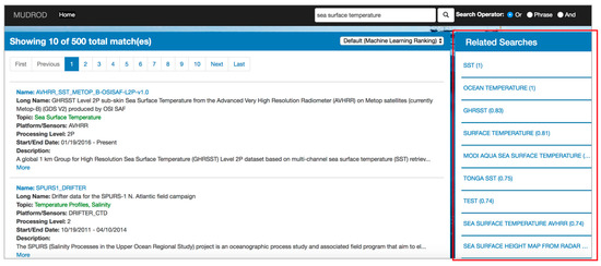 After users log into the system, they type a query (e.g., ocean temperature) into the search box (Figure 6). The auto-completion function helps during typing by predicting the rest of words users intend to enter. When users hit the search button, a list of results is retrieved which has the default ranking of machine learning based ranking. Users can also choose to sort the list by other metrics such as popularity and spatial resolution. On the right-hand side, a list of related searches is displayed (Figure 7). In this particular case, the similar queries of “ocean temperature” are “sst”, “sea surface temperature”, “ghrsst”, etc. Next to each related search is a number in parenthesis representing the semantic similarity value. Users can choose to click on any of these related searches to explore other datasets. If users would like to know more details of a particular dataset in the search list, they can click on the “name” attribute (e.g., VIIRS_NPP-NAVO-L2P-v2.0) and more information such as version, processing level, coverage will be displayed. According to the recommendation algorithm behind the scene, the top related datasets are listed on the right (Figure 8). In this case, the most related dataset is the version 1.0 of collection “VIIRS_NPP-NAVO-L2P” as the dataset that is being viewed is the version 2.0 of it. An online demo system has been made available at https://mudrod.jpl.nasa.gov/#/.