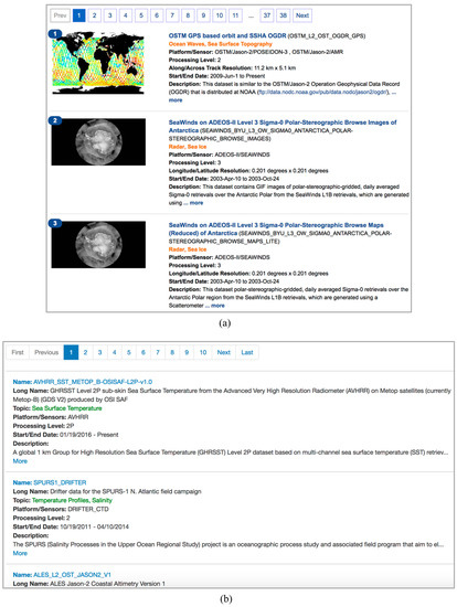 Comparison between the proposed system and PO.DAAC’s search results. (a) Top search results of “sea surface temperature” of PO.DAAC; (b) Top search results of “sea surface temperature” of the proposed system.