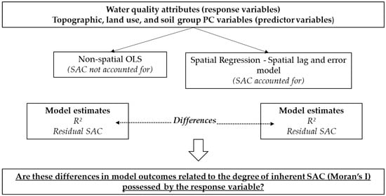 Several water quality studies have compared outcomes between spatial and non-spatial regressions [2,3,4,10,11,27,28,29]. In general, spatial models presented significant increases in R2 values and decreases in residual SAC (rSAC), indicating that spatial model performance exhibited clear improvements over the non-spatial approach. However, as per the literature on hydrological modeling, it is still uncertain when such improvements become large or small. Assuming that each water quality variable presents a unique degree of inherent SAC, we hypothesize that this SAC (possessed by a response variable; i.e., a water quality variable) influences the outcomes of spatial modeling. We test if water quality variables with a higher amount of SAC would exhibit greater improvement in model outcomes than those with a lower amount of SAC (see Figure 1). We evaluate this hypothesis across divergent regions of the USA to enable a general understanding of the effect of SAC possessed by water quality variables. We examine if SAC is a consistent determinant of the magnitude of model improvements even when watershed characteristics diverge. If this is indeed the case, we can potentially determine the degree of improvement in model fit before performing a spatial regression simply by measuring the inherent SAC level of a water quality variable. This study can also serve as a useful screening technique where modelers could use Moran’s I to predict the spatial pattern in the independent variable using a spatially explicit method.
