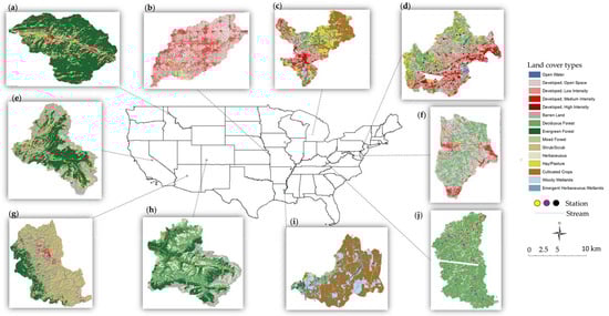 Water stations organization in the stream network and land cover characteristics of each study area. Idaho (a); Kansas (b); Iowa (c); Delaware (d); California (e); Virginia (f); Arizona (g); Colorado (h); Louisiana (i); and Kentucky (j).