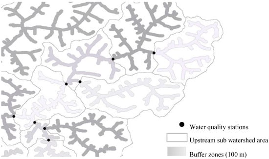 Characteristics of the sub-watershed area upstream of sampling stations affect water quality variables [11]. Thus, sub-watershed boundaries were delimited using the ‘ArcHydro’ package tool of ArcGIS 10.3 (Environmental Systems Research Institute, Redlands, CA, USA). We downloaded spatial stream data from the 2016 US Geological Survey (USGS) National Hydrography Dataset [31]. The distance between stations varied, as did the size of each upstream area delineated. Land use characteristics as well as topography and soil far from the stream channel might contribute less to changes in water quality across space [3]. Thus, we used the upstream area to separate the stream network specific to each station, and delineated the riparian zone around the stream. Many studies have conducted analyses at the riparian area scale, mainly by considering a buffer area on each side of the stream. Overall, there was no specific buffering distance recommended [3,11,32]. In this study, we used a buffer zone of 50 m each side of the stream (i.e., a 100 m buffer in total) as the area that can contribute the maximum to water quality changes (Figure 3). We performed these analyses for all watersheds in this study.