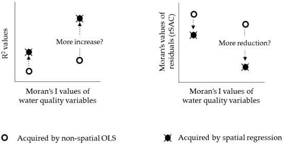 After measuring the inherent degree of SAC for each water quality variable, we compared the outcomes of non-spatial OLS and spatial regression approaches in terms of R2 and rSAC. To quantify rSAC, we estimated Moran’s I for residuals. After the modeling procedure, we evaluated our hypothesis by plotting Moran’s I values of the water quality variables against the R2 and rSAC values for each water quality variable (Figure 4). A few water quality variables presented negative inherent SAC values and were treated as positive in this graph. This is because we intended to concentrate on the magnitude of SAC.