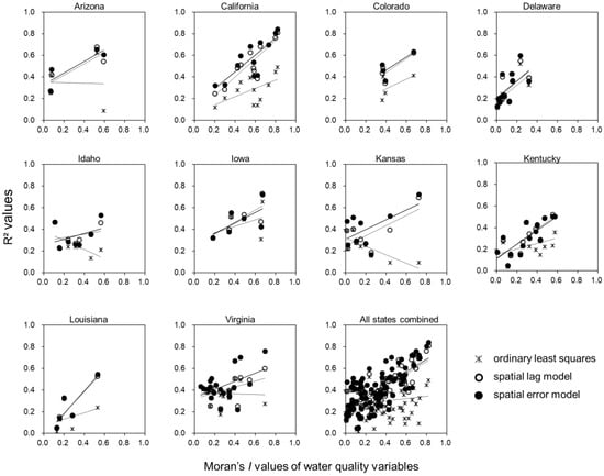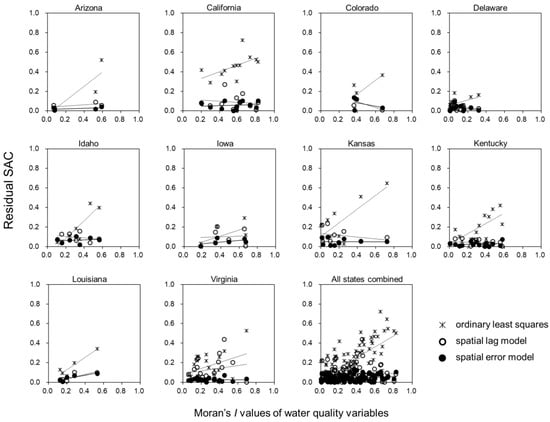 The values of Moran’s I indicating rSAC produced by non-spatial OLS presented a wider range than those from spatial regression (i.e., rSAC for non-spatial OLS from 0.01 to 0.72, while spatial lag rSAC ranged from 0.00 to 0.44, and spatial error, from 0.00 to 0.07). We found a positive correlation between the degree of SAC in water quality variables and rSAC from non-spatial OLS. Conversely, as expected, rSAC values acquired by spatial regressions were in general near zero. Therefore, the larger the Moran’s I values possessed by water quality variables, the greater the reduction in rSAC after running models that consider spatial dependence (Figure 6; the hypothesis predicting greater decreases in rSAC, proportional to the degree of SAC in water quality variables, is supported). All states presented significant reduction in rSAC except Delaware, showing a narrow range of Moran’s I values of water quality variables.