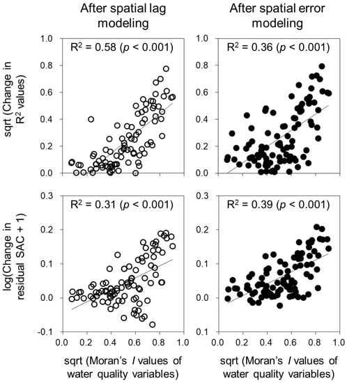 Overall, in this study, we found that the magnitude of model improvement (i.e., increases in R2 and decreases in rSAC), after both spatial lag and error modeling, is significantly and linearly a function of the SAC inherently possessed by water quality variables (i.e., response variables) (Figure 7). This, in turn, supported our hypothesis that water quality variables with a higher amount of SAC would exhibit greater improvement in model outcomes than those with a lower amount of SAC.