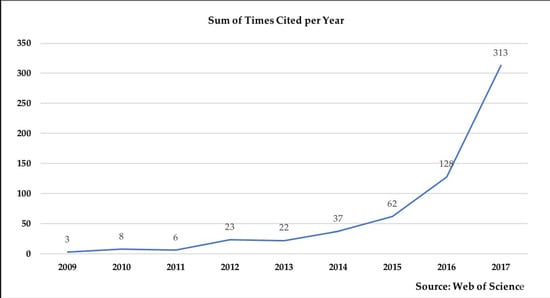 There is now a trend towards merging BIM and GIS. Figure 1 presents the sum of citations per year from 2009 to 2017 regarding BIM/GIS integration. Since 2009, the number of citations has increased 100-fold from only 3 to 313 citations in 2017. Behind the rising curve is researchers’ growing interest in BIM/GIS integration, which also reflects the significance of this topic.