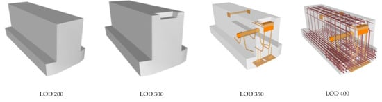 IFC classifies BIM models into five groups according to the details they contain by Levels of Development (LODs), from LOD 100 to LOD 500. Figure 2 shows a precast structural inverted T beam model from LOD 200 to LOD 400. With the increase of LOD, more details are contained in the model. On LOD 200, there is only one solid structure in the model, but on LOD 400, it has already been a complex model with several components, including lifting devices, expansion joints, etc. LOD 100 example is not given, because LOD 100 elements are not geometric representations. Note that LOD 100, 200, 300, 400, and 500 are defined by American Institute of Architects (AIA), while LOD 350 is developed by the BIMForum working group [44], as it was found to be necessary to define a LOD between LOD 300 and LOD 400 for detailed coordination between disciplines, e.g., clash detection/avoidance, layout, etc.