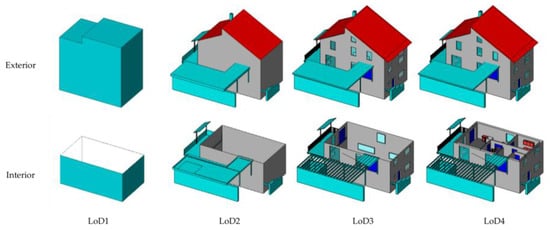CityGML is an open standard data model and exchange format to store 3D models of cities and landscapes based on Geography Markup Language defined by the Open Geospatial Consortium (OGC) in Extensible Markup Language (XML) format [31]. It is an application schema for GML 3.1.1 (GML3) that is a standard for sharing or exchanging 2D and 3D geospatial information over the internet [42]. It defines the basic entities, attributes, and relations of a city, which is essential for cost-effective sustainable 3D city model maintenance. Similarly, for most XML-based data models, there are two parts to CityGML—the schema that describes the document and the instance document that contains the actual data. As with IFC, CityGML has definitions for different Levels of Detail (LoDs) from LoD0 to LoD4 to reflect the amount of detail included in a model. Figure 3 presents building models of a single residential building in LoD1 to LoD4. Obviously, more content is included in a model with a higher LoD. LoD0 model is just the footprint of the building (in 2D), while LoD1 models are the basic block model with flat roofs. In LoD3 and LoD4, the models incorporate doors and windows and have close exterior views, while their internal components are quite different. LoD4 contains interior spaces (rooms) and internal walls, while the model in LoD3 does not. However, the building model in CityGML is less complete and mature as in BIM, even in LoD4 [33].